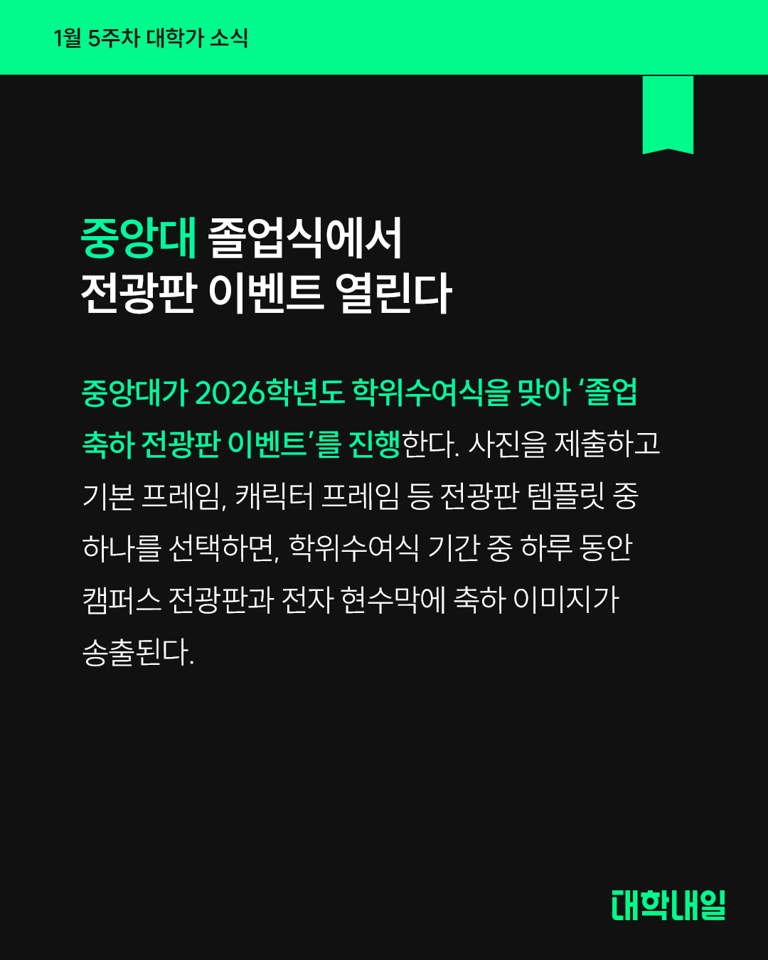 중앙대가 2026학년도 학위수여식을 맞아 ‘졸업 축하 전광판 이벤트’를 진행한다. 사진을 제출하고 기본 프레임, 캐릭터 프레임 등 전광판 템플릿 중 하나를 선택하면, 학위수여식 기간 중 하루 동안 캠퍼스 전광판과 전자 현수막에 축하 이미지가 송출된다.