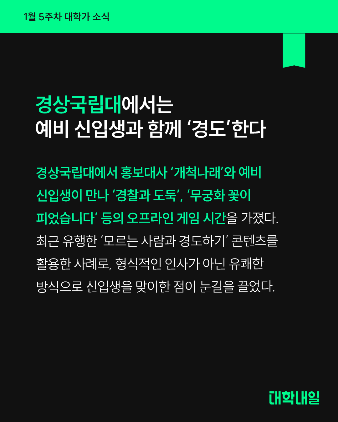 경상국립대에서 홍보대사 ‘개척나래’와 예비 신입생이 만나 ‘경찰과 도둑’, ‘무궁화 꽃이 피었습니다’ 등의 오프라인 게임 시간을 가졌다. 최근 유행한 ‘모르는 사람과 경도하기’ 콘텐츠를 활용한 사례로, 형식적인 인사가 아닌 유쾌한 방식으로 신입생을 맞이한 점이 눈길을 끌었다.
