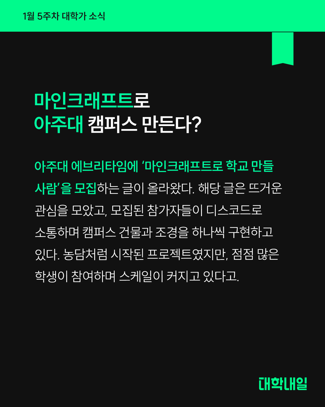 아주대 에브리타임에 ‘마인크래프트로 학교 만들 사람’을 모집하는 글이 올라왔다. 해당 글은 뜨거운 관심을 모았고, 모집된 참가자들이 디스코드로 소통하며 캠퍼스 건물과 조경을 하나씩 구현하고 있다. 농담처럼 시작된 프로젝트였지만, 점점 많은 학생이 참여하며 스케일이 커지고 있다고.