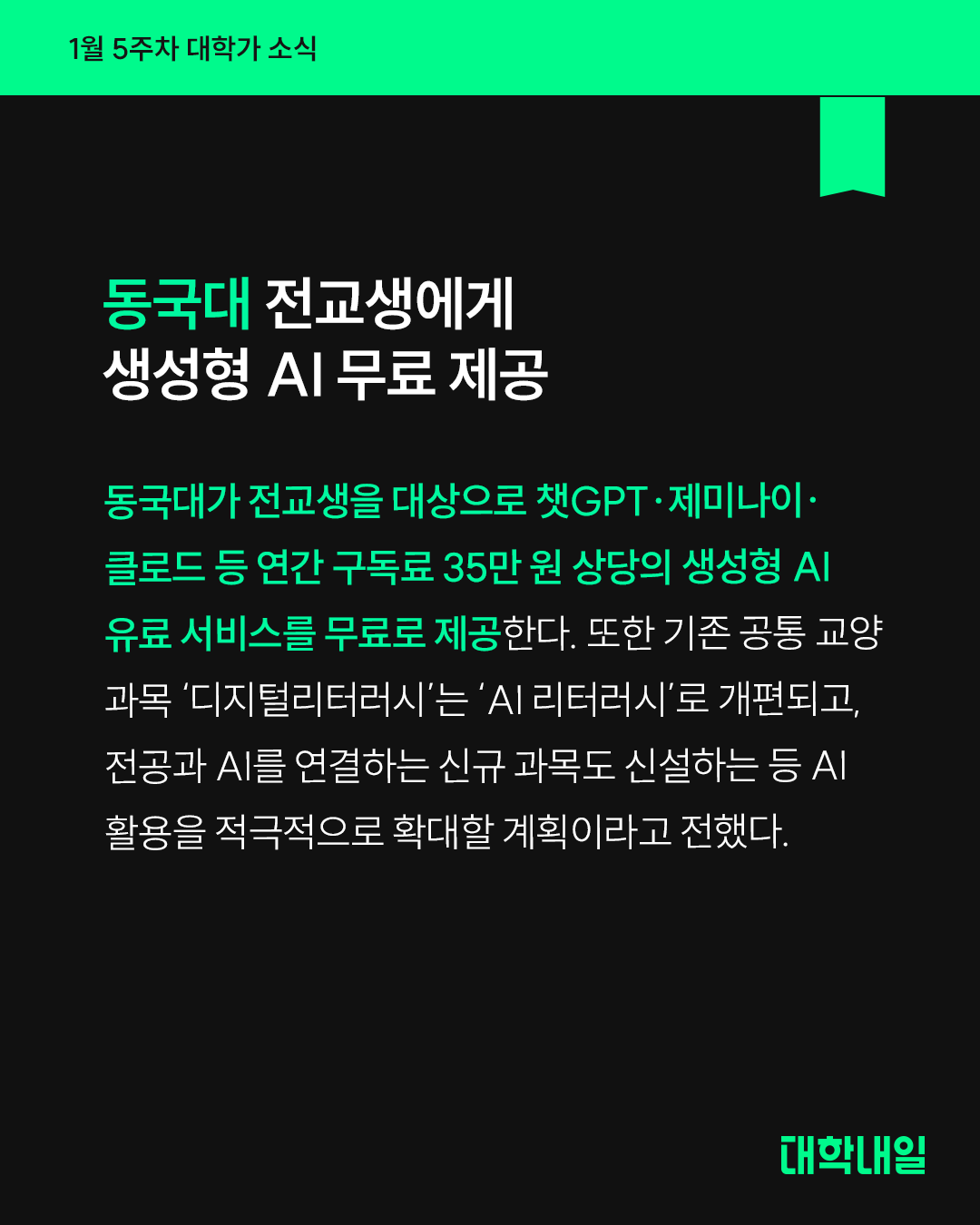 동국대가 전교생을 대상으로 챗GPT·제미나이·클로드 등 연간 구독료 35만 원 상당의 생성형 AI 유료 서비스를 무료로 제공한다. 또한 기존 공통 교양 과목 ‘디지털리터러시’는 ‘AI 리터러시’로 개편되고, 전공과 AI를 연결하는 신규 과목도 신설하는 등 AI 활용을 적극적으로 확대할 계획이라고 전했다.