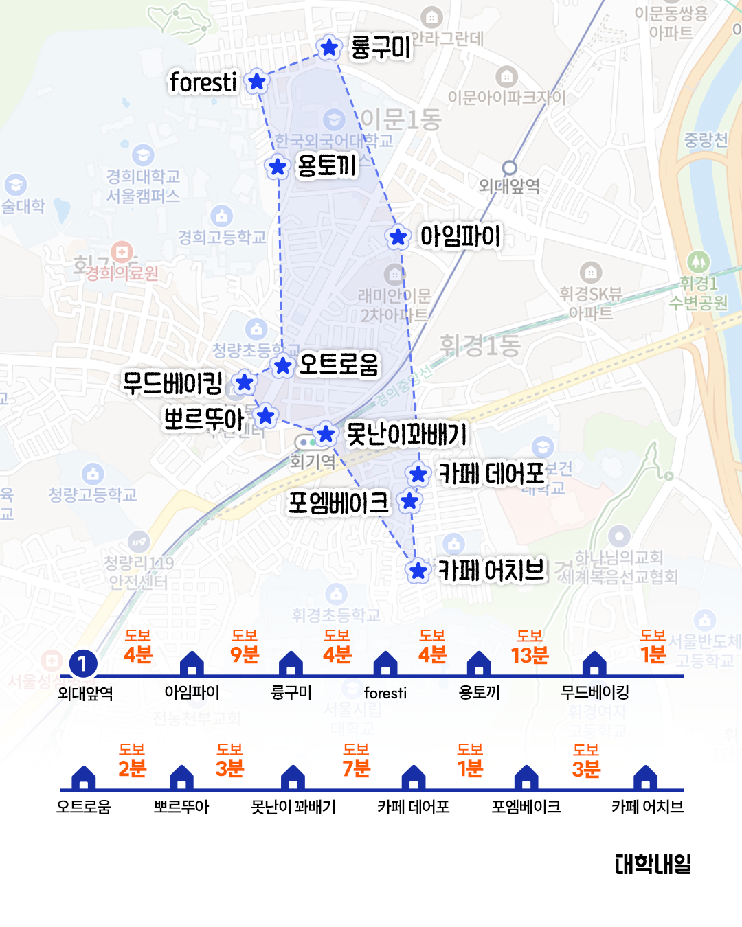리포터가 네이버 지도로 직접 정리한 1호선 대학가 빵지순례 지도와 아래 동선을 참고해 천천히 돌아보길 추천한다.