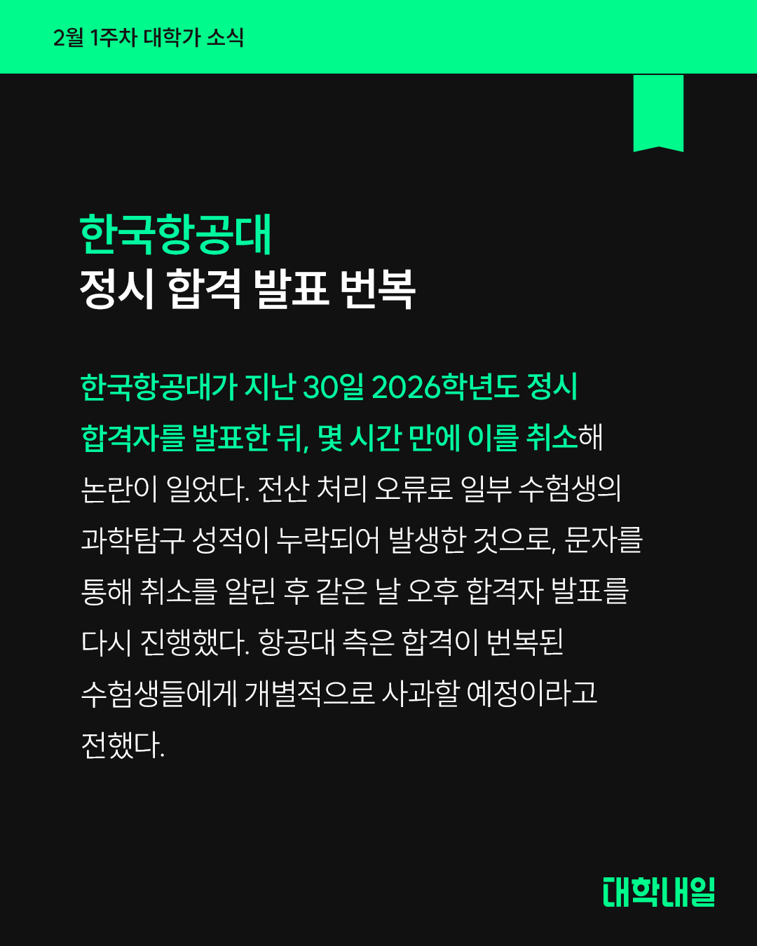 한국항공대가 지난 30일 2026학년도 정시 합격자를 발표한 뒤, 몇 시간 만에 이를 취소해 논란이 일었다. 전산 처리 오류로 일부 수험생의 과학탐구 성적이 누락되어 발생한 것으로, 문자를 통해 취소를 알린 후 같은 날 오후 합격자 발표를 다시 진행했다. 항공대 측은 합격이 번복된 수험생들에게 개별적으로 사과할 예정이라고 전했다.