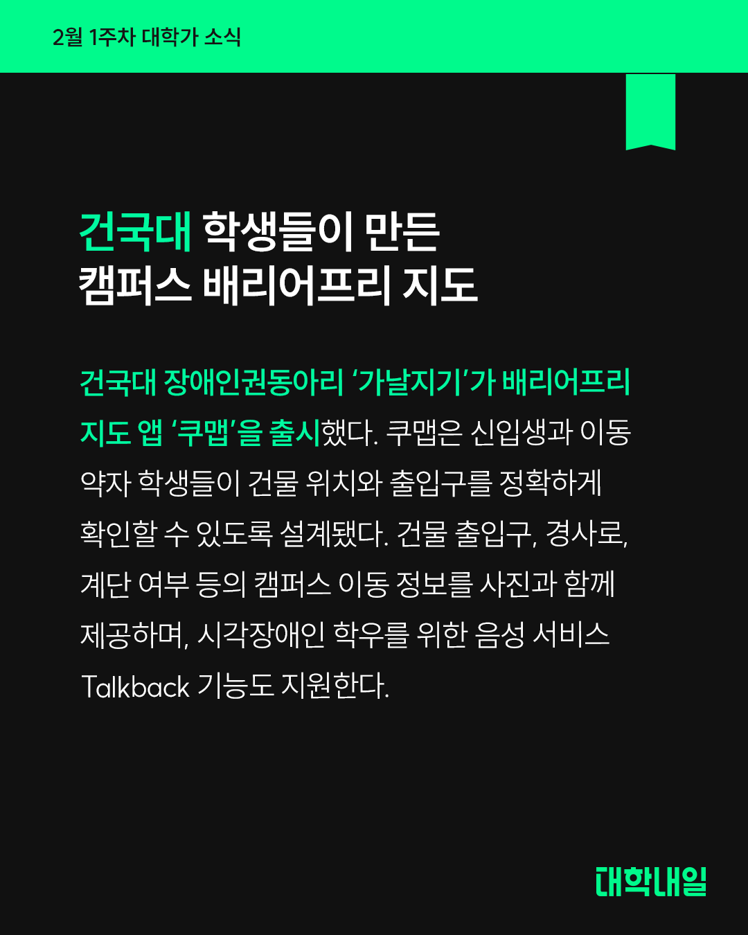 건국대 장애인권동아리 ‘가날지기’가 배리어프리 지도 앱 ‘쿠맵’을 출시했다. 쿠맵은 신입생과 이동 약자 학생들이 건물 위치와 출입구를 정확하게 확인할 수 있도록 설계됐다. 건물 출입구, 경사로, 계단 여부 등의 캠퍼스 이동 정보를 사진과 함께 제공하며, 시각장애인 학우를 위한 음성 서비스 Talkback 기능도 지원한다.