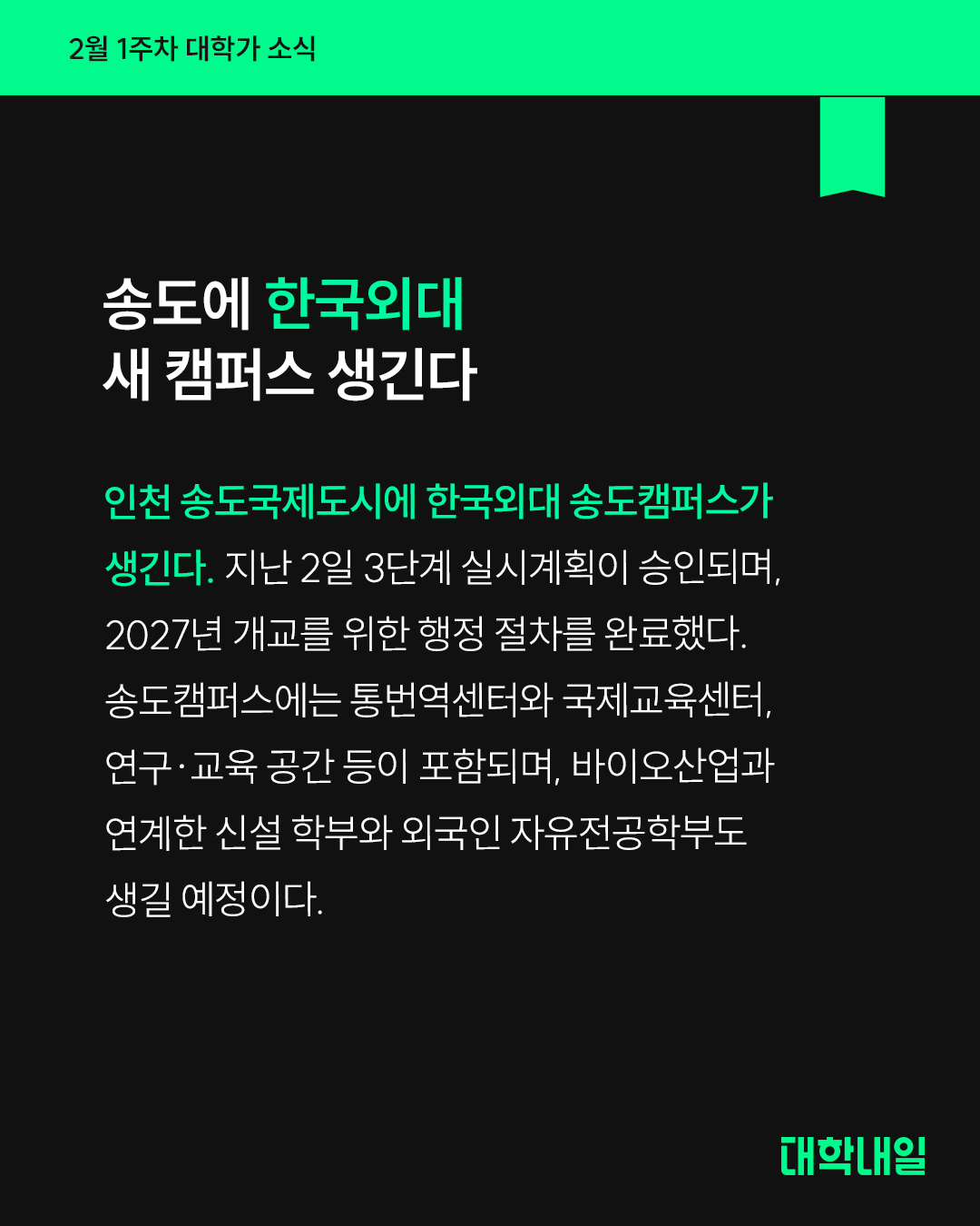 인천 송도국제도시에 한국외대 송도캠퍼스가 생긴다. 지난 2일 3단계 실시계획이 승인되며, 2027년 개교를 위한 행정 절차를 완료했다. 송도캠퍼스에는 통번역센터와 국제교육센터, 연구·교육 공간 등이 포함되며, 바이오산업과 연계한 신설 학부와 외국인 자유전공학부도 생길 예정이다.