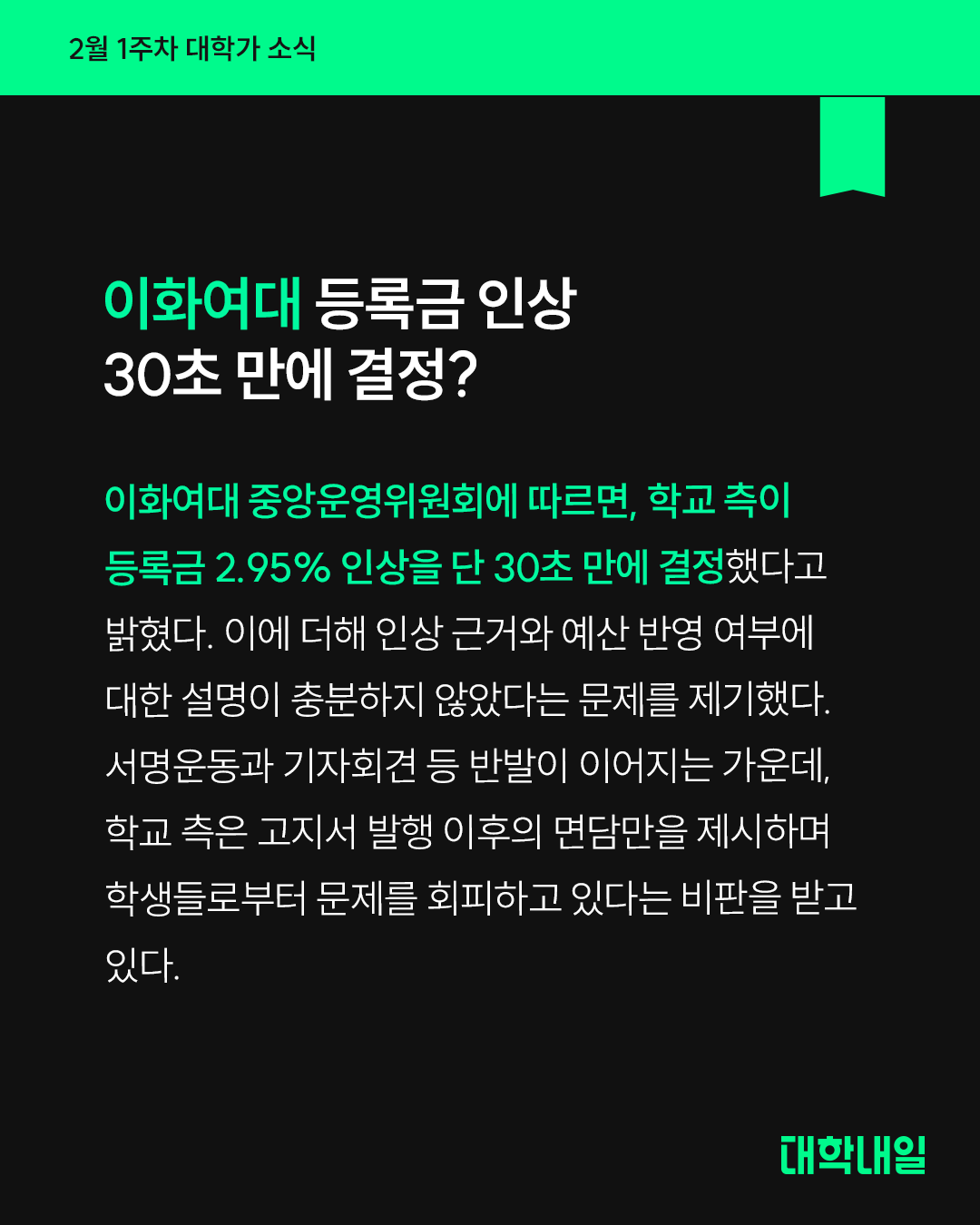 이화여대 중앙운영위원회에 따르면, 학교 측이 등록금 2.95% 인상을 단 30초 만에 결정했다고 밝혔다. 이에 더해 인상 근거와 예산 반영 여부에 대한 설명이 충분하지 않았다는 문제를 제기했다. 서명운동과 기자회견 등 반발이 이어지는 가운데, 학교 측은 고지서 발행 이후의 면담만을 제시하며 학생들로부터 문제를 회피하고 있다는 비판을 받고 있다.