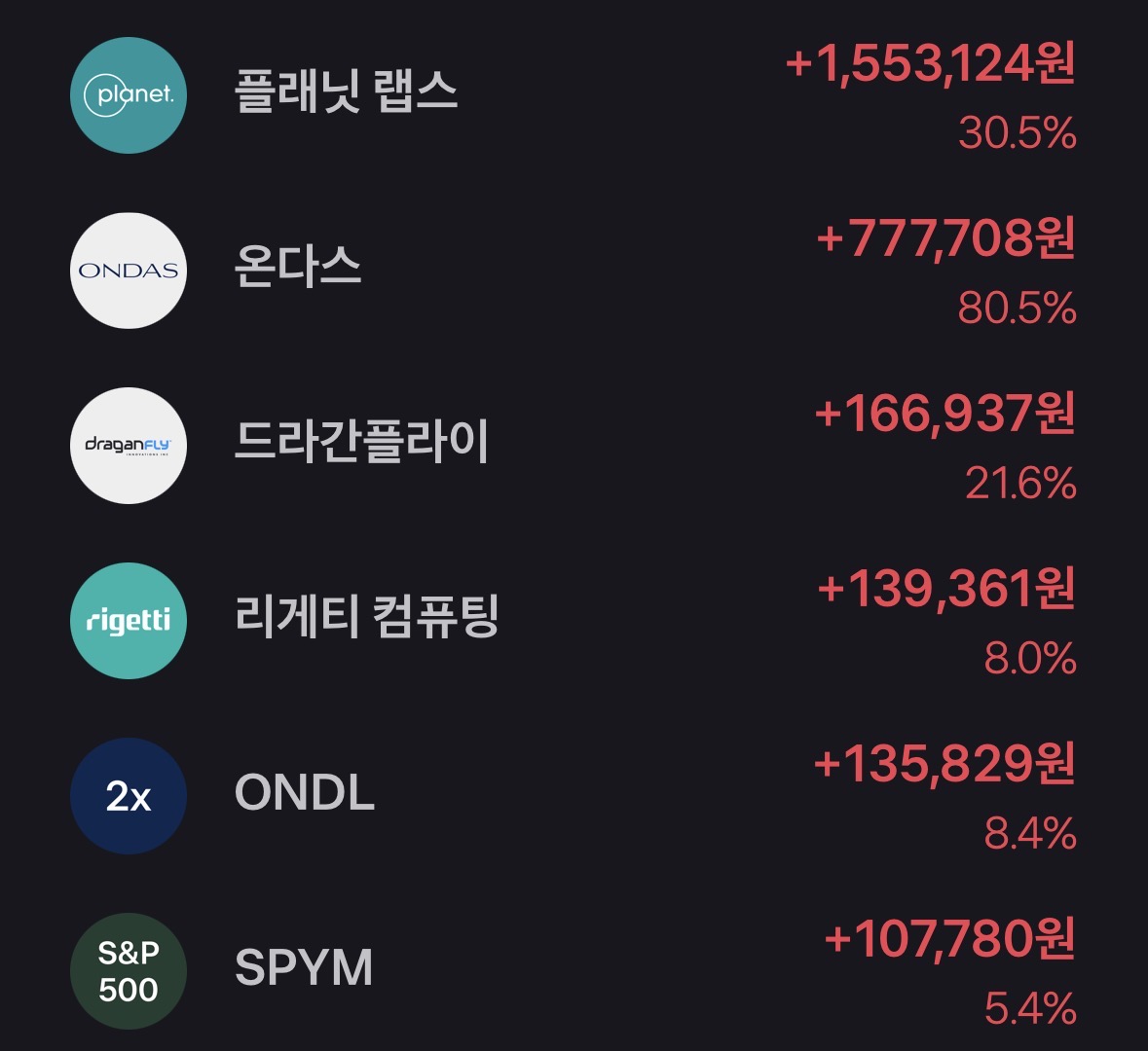 이후에는 리게티컴퓨팅이나 로켓랩 같은 종목에도 투자했어요. 여러 분야를 거치다가 최근 3개월 전부터는 우주·드론·방산 분야에 비교적 집중하고 있습니다. 한 분야에만 올인하기보다는 흐름을 보면서 조금씩 조정하는 편이에요.