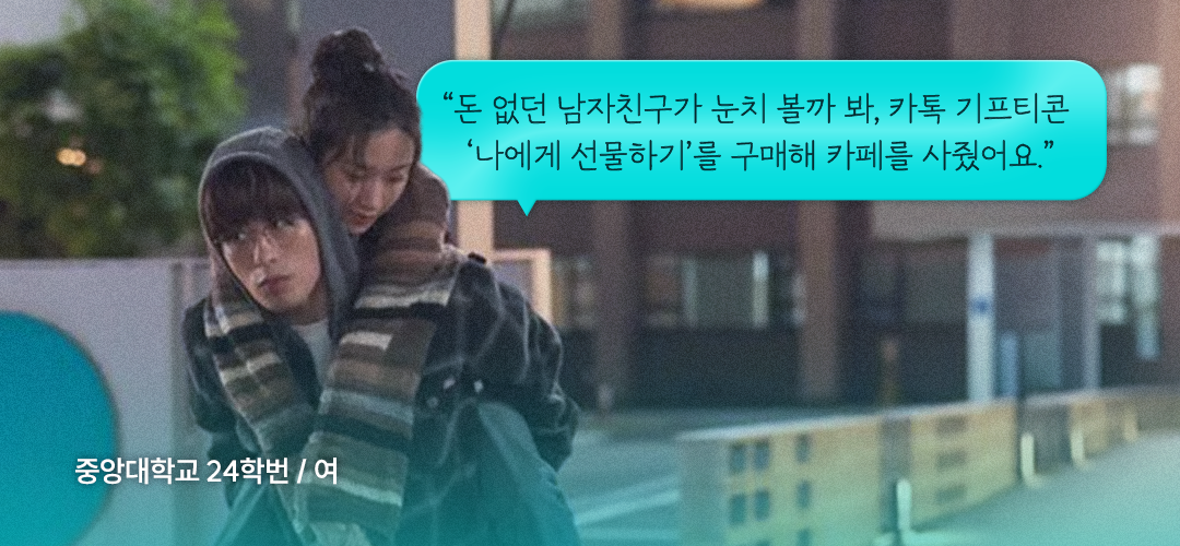 고등학교 때는 몰랐지만, 대학교에 와서 상대방의 주머니 사정이 여유롭지 않다는 걸 알게 되었어요. 데이트 비용을 부담스러워했지만, 제가 사주는 건 용납하지 않고 알바를 늘리던 남자친구를 위해 늘 데이트 전날 ‘카카오톡 기프티콘 나에게 선물하기’를 통해 카페 기프티콘을 준비해 갔어요. 기프티콘으로 쏜다고 하면 남자친구가 마음 편히 저와 시간을 보낼 수 있지 않을까 했죠.