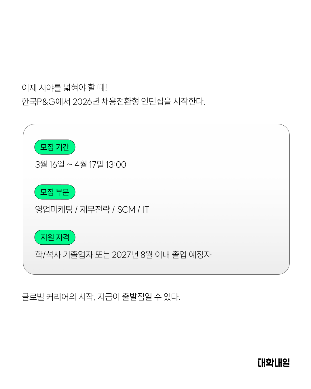 한국 P&G에서 2026년 채용전환형 인턴십을 시작한다.