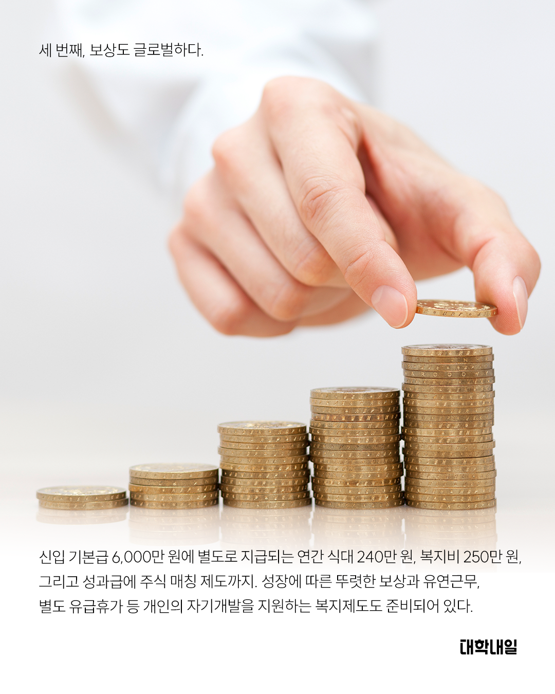 세 번째, 보상도 글로벌하다. 신입 기본급 6,000만 원에 별도로 지급되는 연간 식대 240만 원, 복지비 250만 원, 그리고 성과급에 주식 매칭 제도까지. 성장에 따른 뚜렷한 보상과 유연근무, 별도 유급휴가 등 개인의 자기개발을 지원하는 복지제도도 준비되어 있다.
