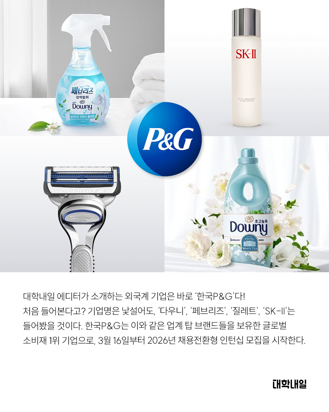 대학내일 에디터가 소개하는 외국계 기업은 바로 ‘한국P&G’다! 처음 들어본다고? 기업명은 낯설어도, ‘다우니’, ‘페브리즈’, '질레트', ‘SK-II’는 들어봤을 것이다. 한국 P&G는 이와 같은 탑 브랜드들을 보유한 글로벌 소비재 1위 기업으로, 3월 16일부터 2026년 채용전환형 인턴십을 시작한다.