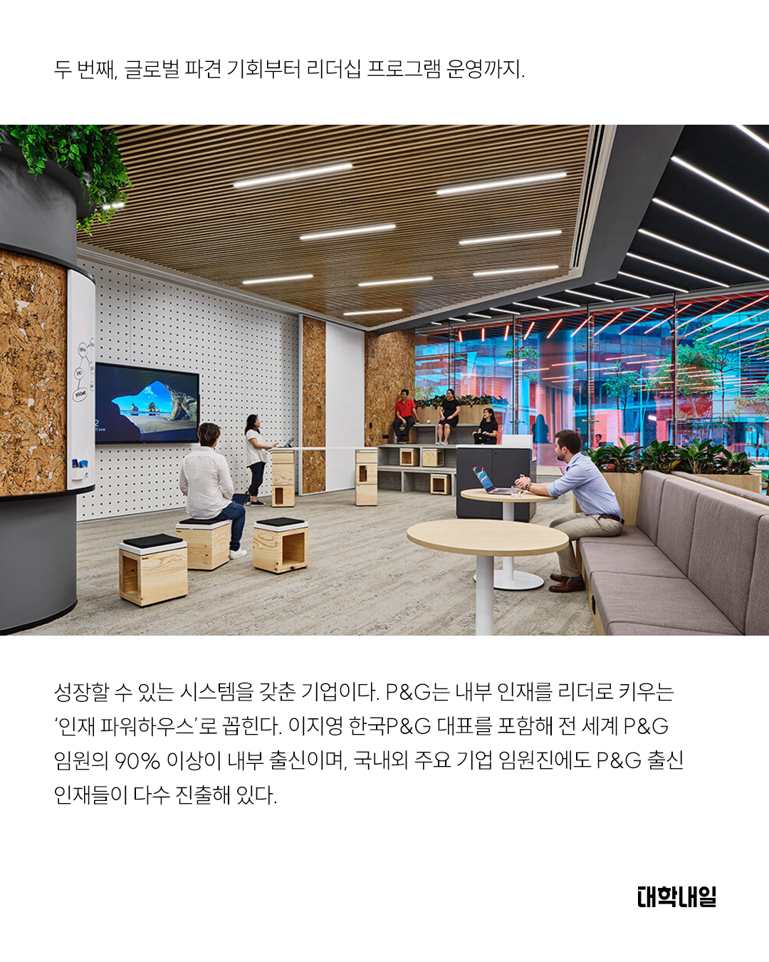 두 번째, 글로벌 파견 기회부터 리더십 프로그램 운영까지. 성장할 수 있는 시스템을 갖춘 기업이다. P&G는 내부 인재를 리더로 키우는 '인재 파워하우스'로 꼽힌다. 이지영 한국P&G 대표를 포함해 전 세계 P&G 임원의 90& 이상이 내부 출신이며, 국내외 주요 기업 임원진에도 P&G 출신 인재들이 다수 진출해 있다.