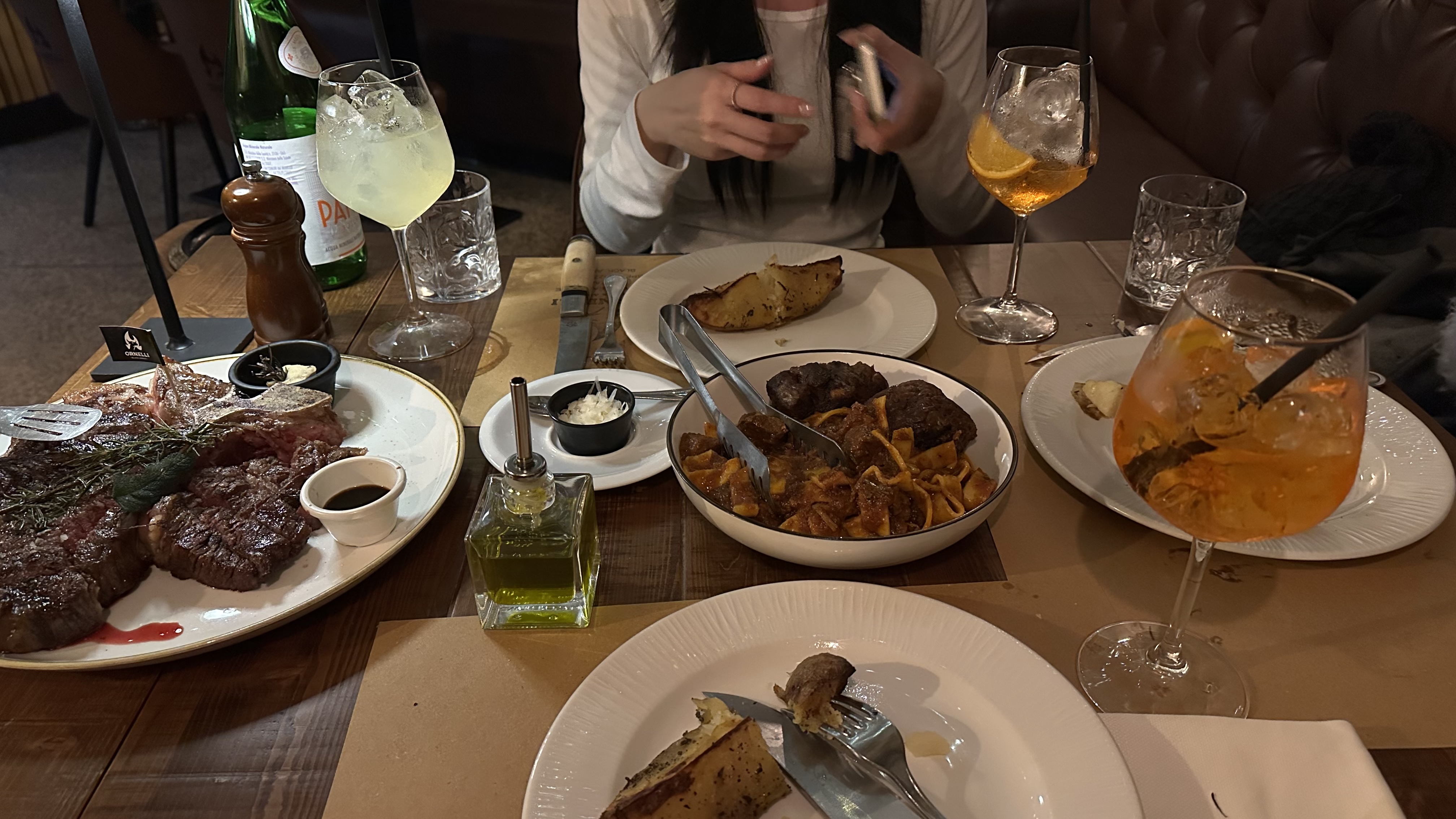 유럽에서 여자 혼자 늦은 밤 야경을 보러 다니는 것은 위험해서, 민박에서 친분을 쌓은 여자 셋이서 야경 투어를 떠났습니다. 여행 동안 혼자 돌아다니느라 제대로 된 식당에서 맛있는 음식을 먹지 못해 아쉬움이 남았었는데, 이들 덕분에 로마에서도 비싼 축에 속하는 레스토랑에 가서 엄청난 스테이크를 먹었어요. 오랜만에 사람들과 함께하니 입이 쉬지 않아 더 즐거웠어요.