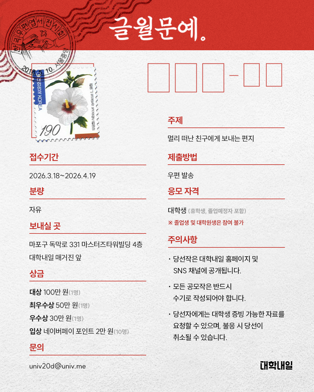 지금, 멀리 떠난 그 친구에게 한 통의 편지를 써 보세요. 4월 19일까지 우편 접수.