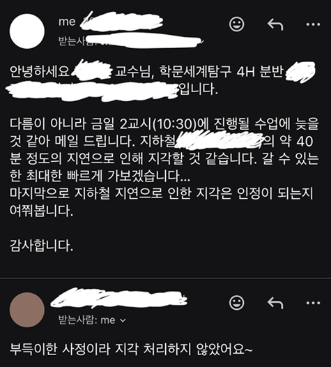 입학한 지 한 달도 안 되었을 때 지하철이 고장 나서 수업을 지각했던 적이 있어요. 사람이 너무 많아서 숨쉬기도 힘든 상태로 한참을 갇혀 있었고, 열차는 기어가듯 천천히 움직여서 폐소공포증이 올 거 같았어요. 30분 넘게 지연되면서 떨리는 마음으로 교수님께 첫 지각 사유 메일을 보내야만 했습니다.