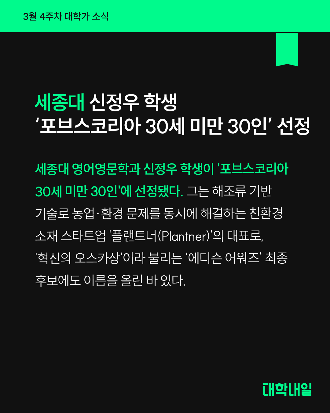 세종대 영어영문학과 신정우 학생이 '포브스코리아 30세 미만 30인'에 선정됐다. 그는 해조류 기반 기술로 농업·환경 문제를 동시에 해결하는 친환경 소재 스타트업 '플랜트너(Plantner)'의 대표로, '혁신의 오스카상'이라 불리는 ‘에디슨 어워즈’ 최종 후보에도 이름을 올린 바 있다.