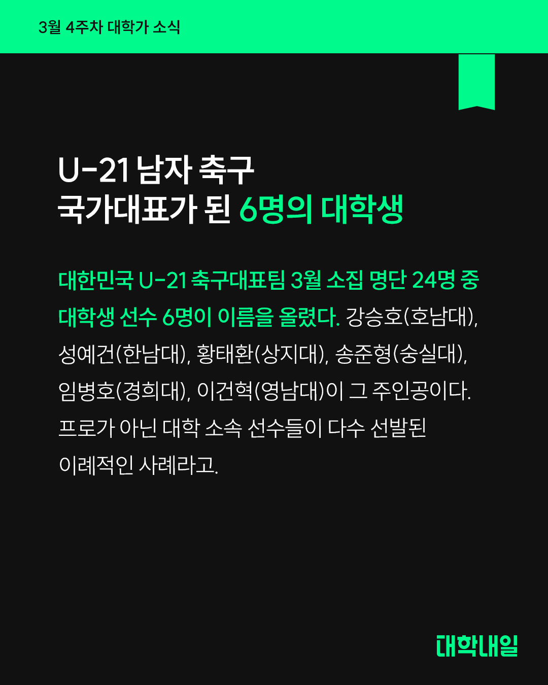대한민국 U-21 축구대표팀 3월 소집 명단 24명 중 대학생 선수 6명이 이름을 올렸다. 강승호(호남대), 성예건(한남대), 황태환(상지대), 송준형(숭실대), 임병호(경희대), 이건혁(영남대)이 그 주인공이다. 프로가 아닌 대학 소속 선수들이 다수 선발된 이례적인 사례라고.