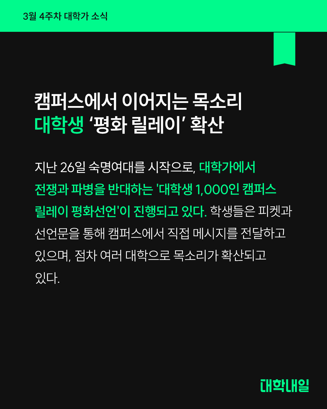 지난 26일 숙명여대를 시작으로, 대학가에서 전쟁과 파병을 반대하는 '대학생 1,000인 캠퍼스 릴레이 평화선언'이 진행되고 있다. 학생들은 피켓과 선언문을 통해 캠퍼스에서 직접 메시지를 전달하고 있으며, 점차 여러 대학으로 목소리가 확산되고 있다.