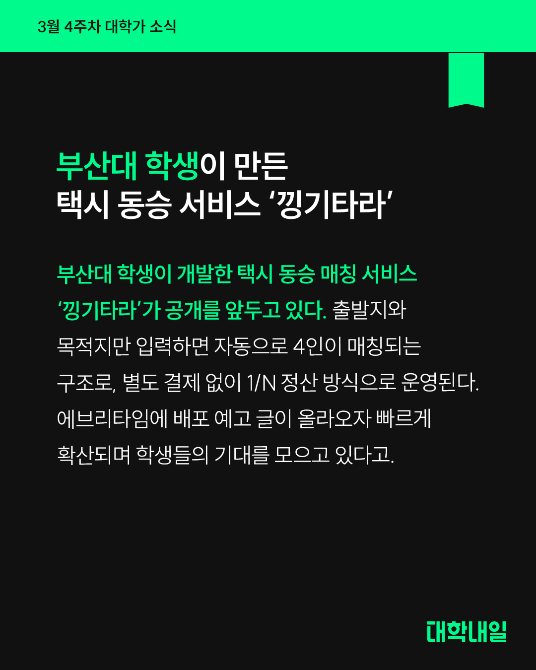 부산대 학생이 1인 개발한 택시 동승 매칭 서비스 ‘낑기타라’가 공개를 앞두고 있다. 출발지와 목적지만 입력하면 자동으로 4인이 매칭되는 구조로, 별도 결제 없이 1/N 정산 방식으로 운영된다. 에브리타임에 배포 예고 글이 올라오자 빠르게 확산되며 학생들의 기대를 모으고 있다고.