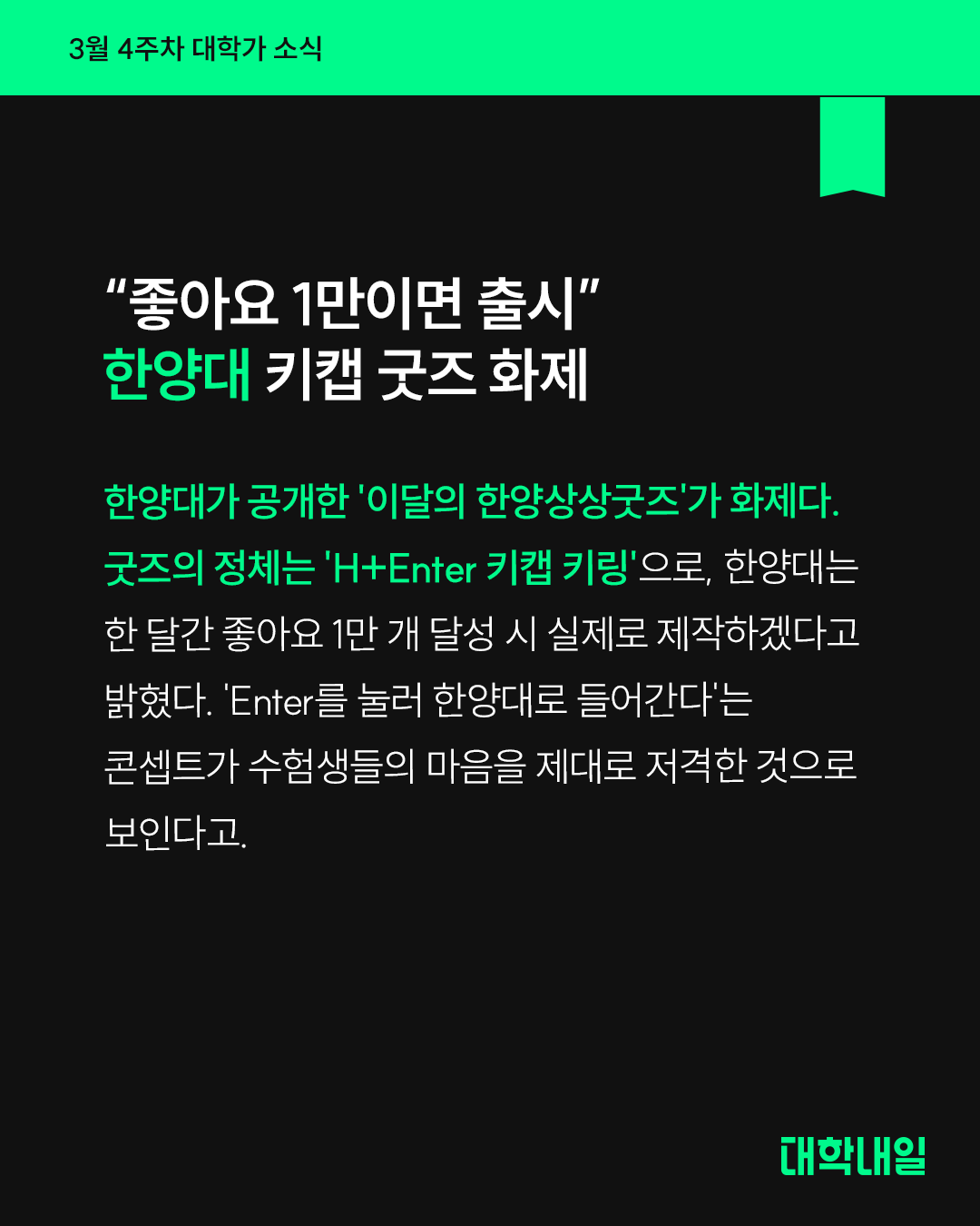 한양대가 공개한 '이달의 한양상상굿즈'가 화제다. 굿즈의 정체는 'H+Enter 키캡 키링'으로, 한양대는 한 달간 좋아요 1만 개 달성 시 실제로 제작하겠다고 밝혔다. 'Enter를 눌러 한양대로 들어간다'는 콘셉트가 수험생들의 마음을 제대로 저격한 것으로 보인다고.