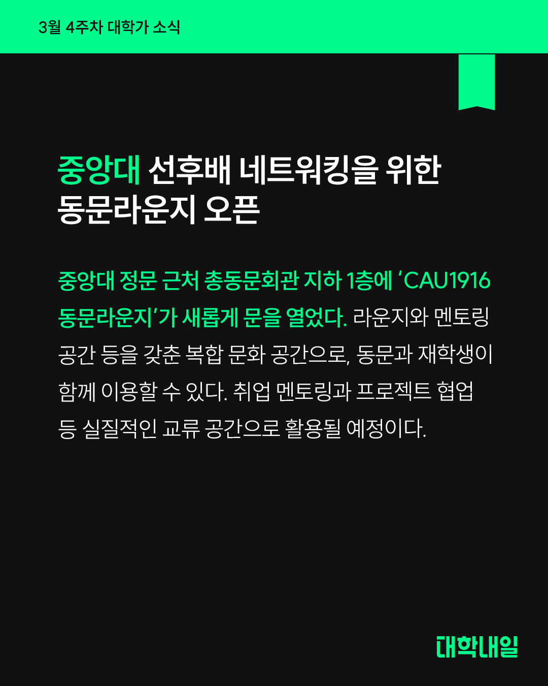 중앙대 정문 근처 총동문회관 지하 1층에 ‘CAU1916 동문라운지’가 새롭게 문을 열었다.라운지와 멘토링 공간 등을 갖춘 복합 문화 공간으로, 동문과 재학생이 함께 이용할 수 있다. 취업 멘토링과 프로젝트 협업 등 실질적인 교류 공간으로 활용될 예정이다.