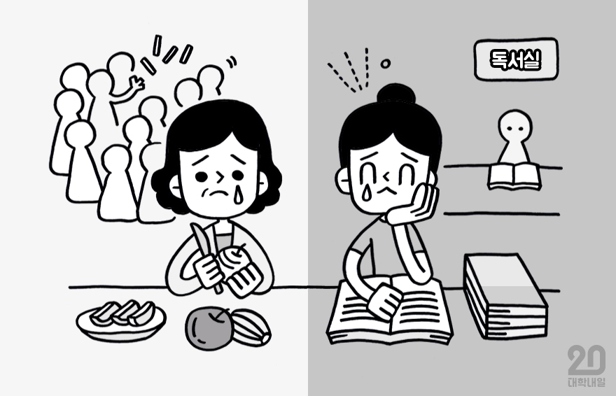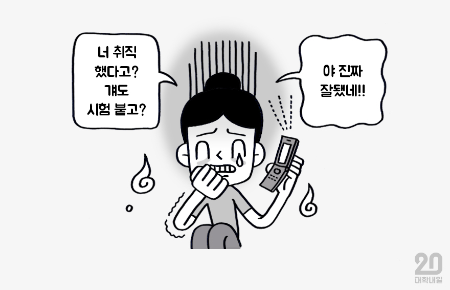 명절에도 당연히 집에 갈 수 없다. 친척들이 모이면 내 상황에 대해 한 마디씩 거들기 때문이다. 응원과 관심도 부담스러워 미칠 지경인데 잔소리에 비아냥은 견딜 수 없으니 일찌감치 대피하는 것이 낫다. 비록 그런 모습이 안쓰러워 엄마가 눈물짓더라도, 그게 또 미안해 도서관에서 눈물을 참느라 고생하더라도.