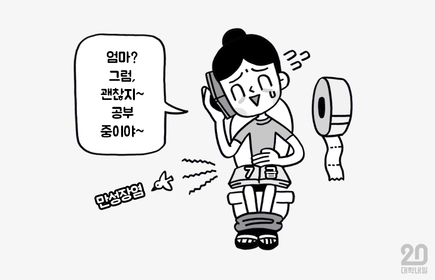 매일 책상에만 앉아 있으니 몸이 아픈 건 당연하다. 잘 먹지도 잘 자지도 않고 스트레스까지 받으니 몸이 남아나랴. 장염은 흔한 질병이고, 신종플루로 고생하는 사람도 많다. 10분에 한 번씩 화장실을 들락거리고, 타미플루 부작용으로 계속 토하면서도 공부를 놓을 수가 없다. 당장 오늘 공부가 급하고 시험이 코 앞이니까. 지난 일 년 노력이 모두 물거품이 될까 무서워서.