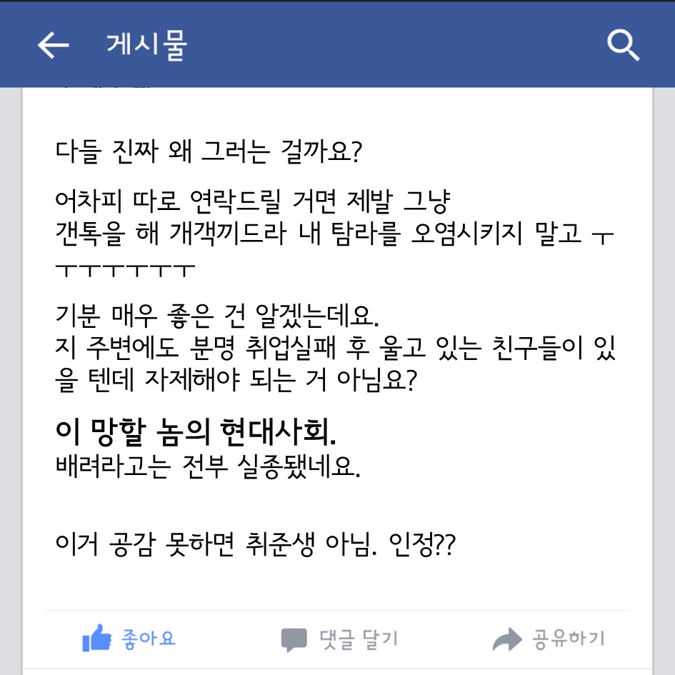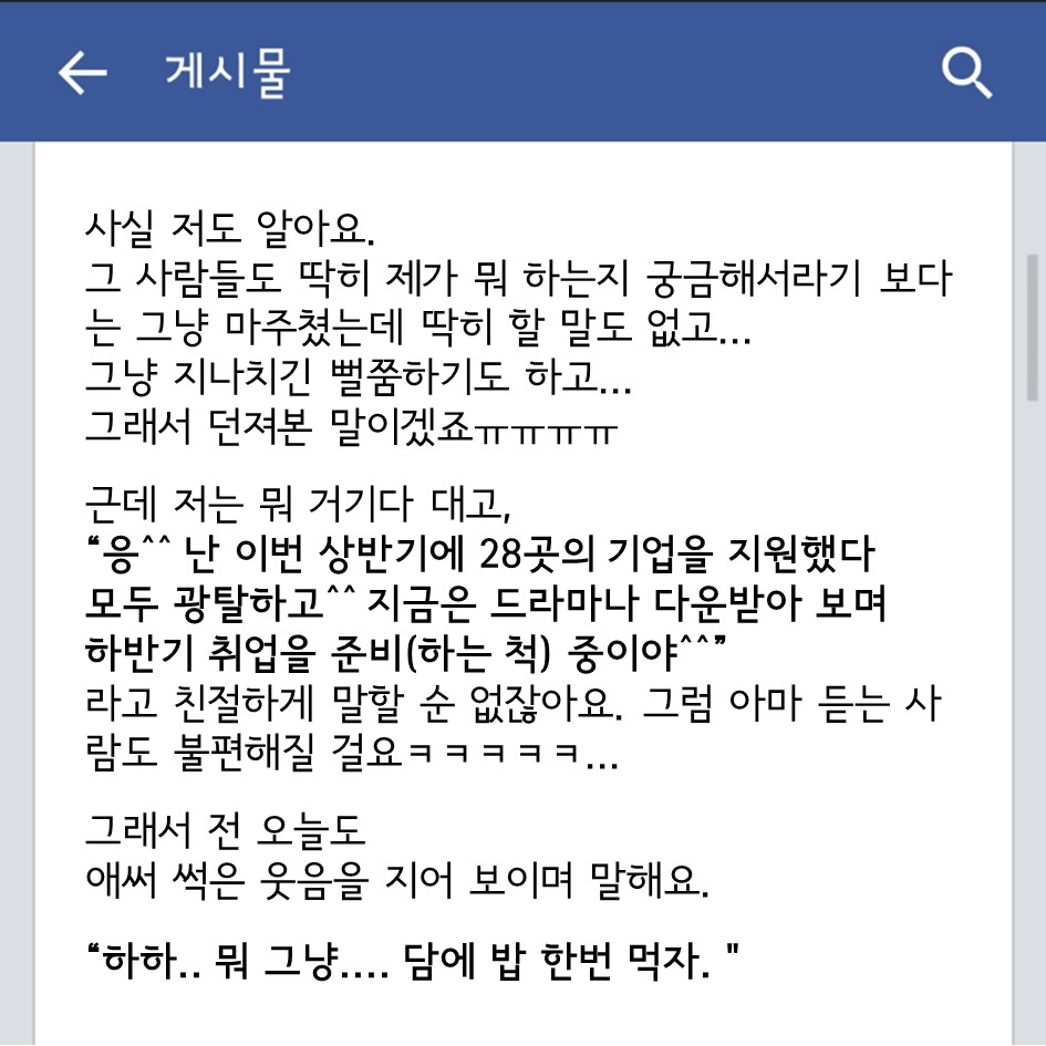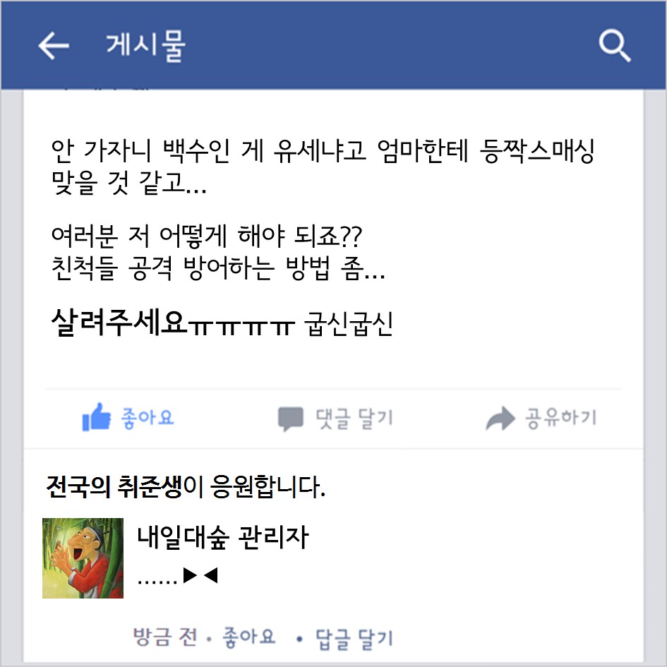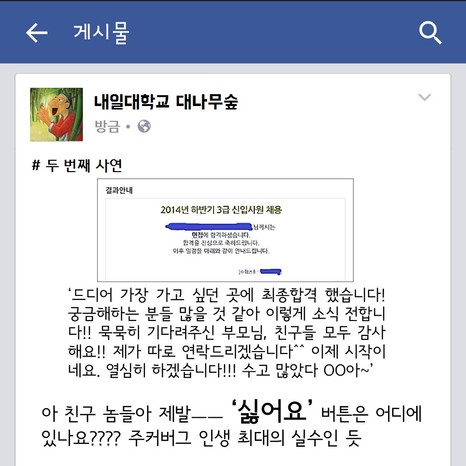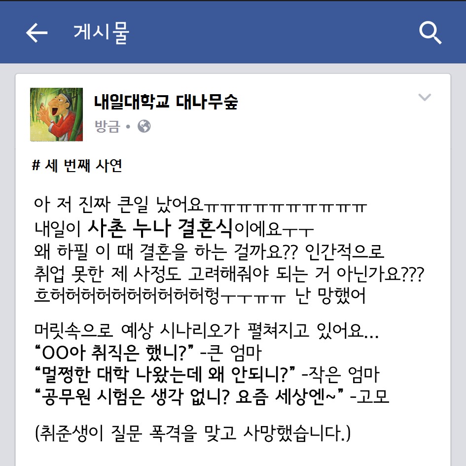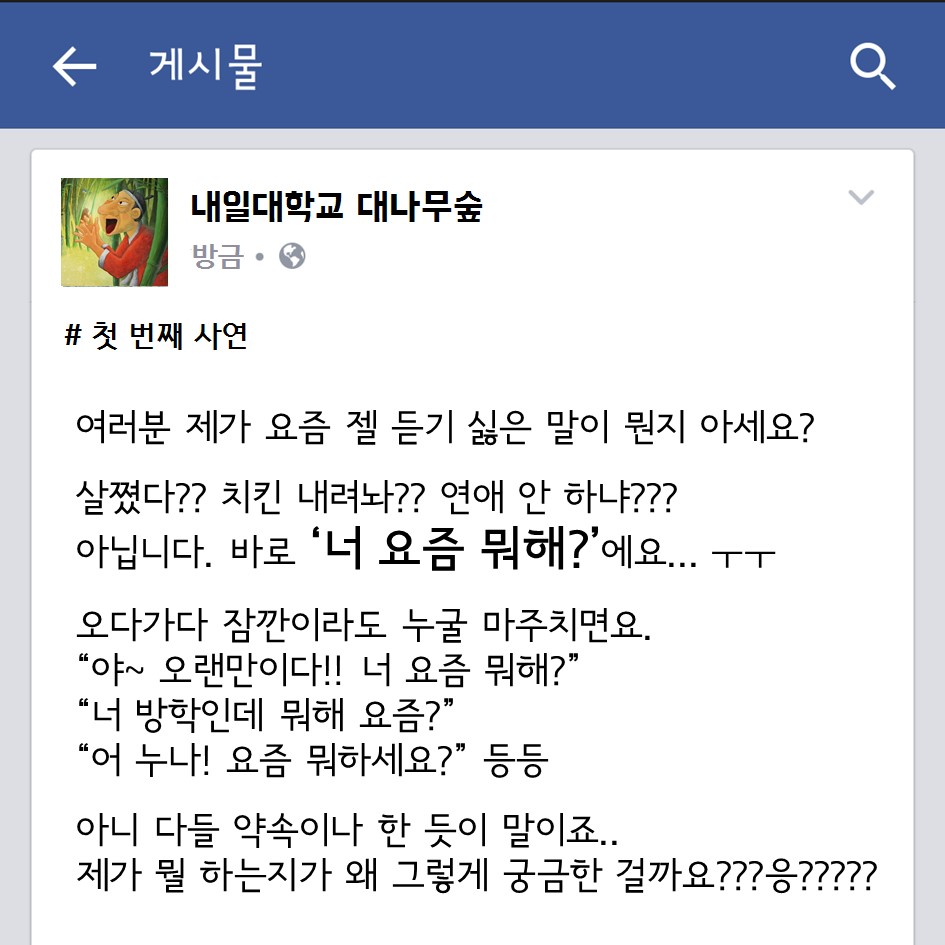 대학내일 취준생의, 취준생에 의한, 취준생을 위한 대나무숲 꽉 막힌 속을 뻥- 하고 뚫어줄 대나무숲이 개장했다 무엇이든 들어드립니다 대학내일 에디터 2015.07.20 혼자만 끙끙 앓다가는 병 된다. 욕설, 스팸 빼고는 어떤 말도 다 들어주니 아래 메일로 고민 있으면 털어 놓아봐. 다음에 소개 해줄게. #개이득#대나무숲#라이프 광고 배너