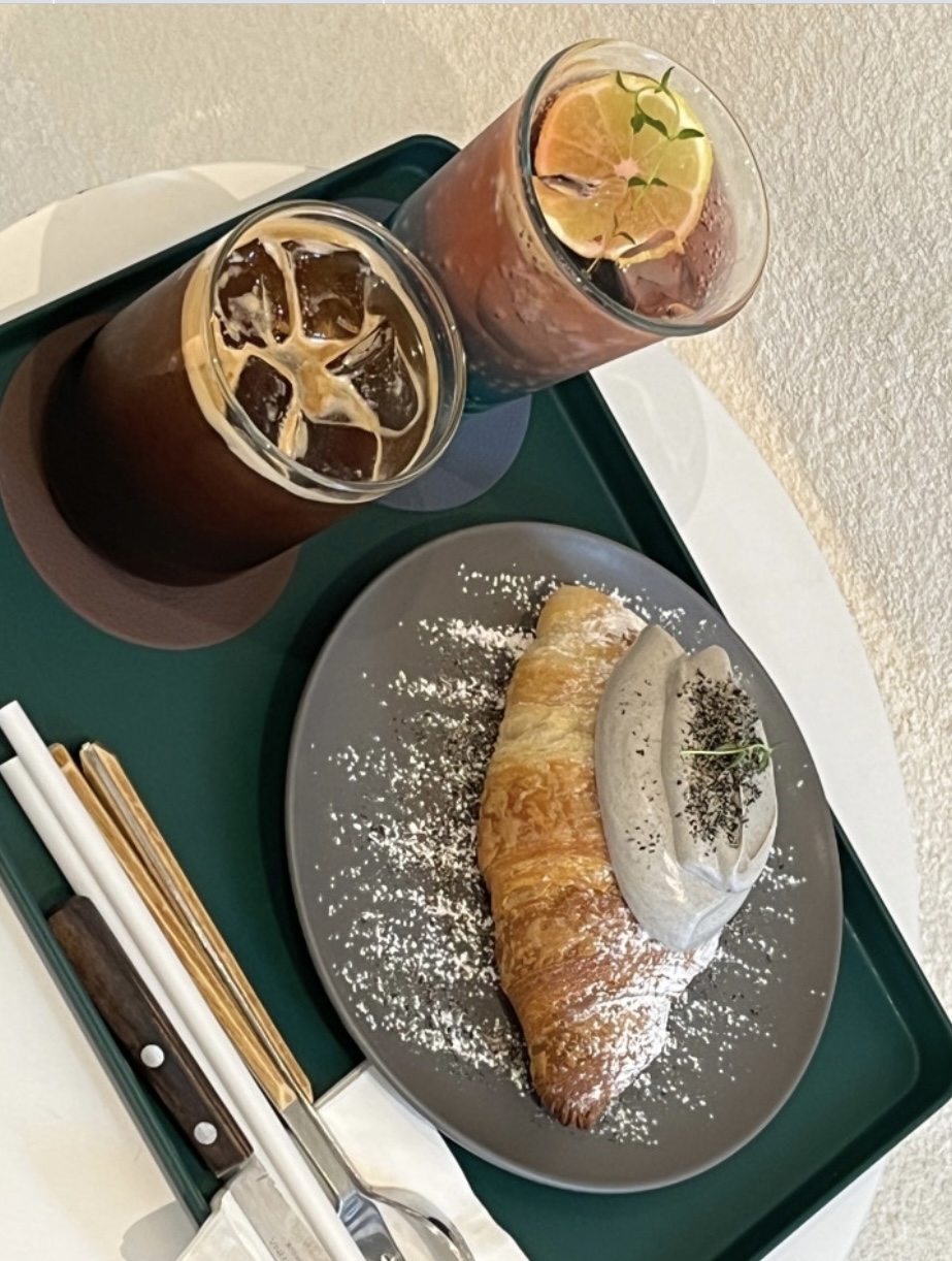 [흑임자 크루아상], [아이스아메리카노], [엘더 플라워 에이드]음료수 색감도 너무 예쁘고, 시그니처 흑임자 크루아상까지