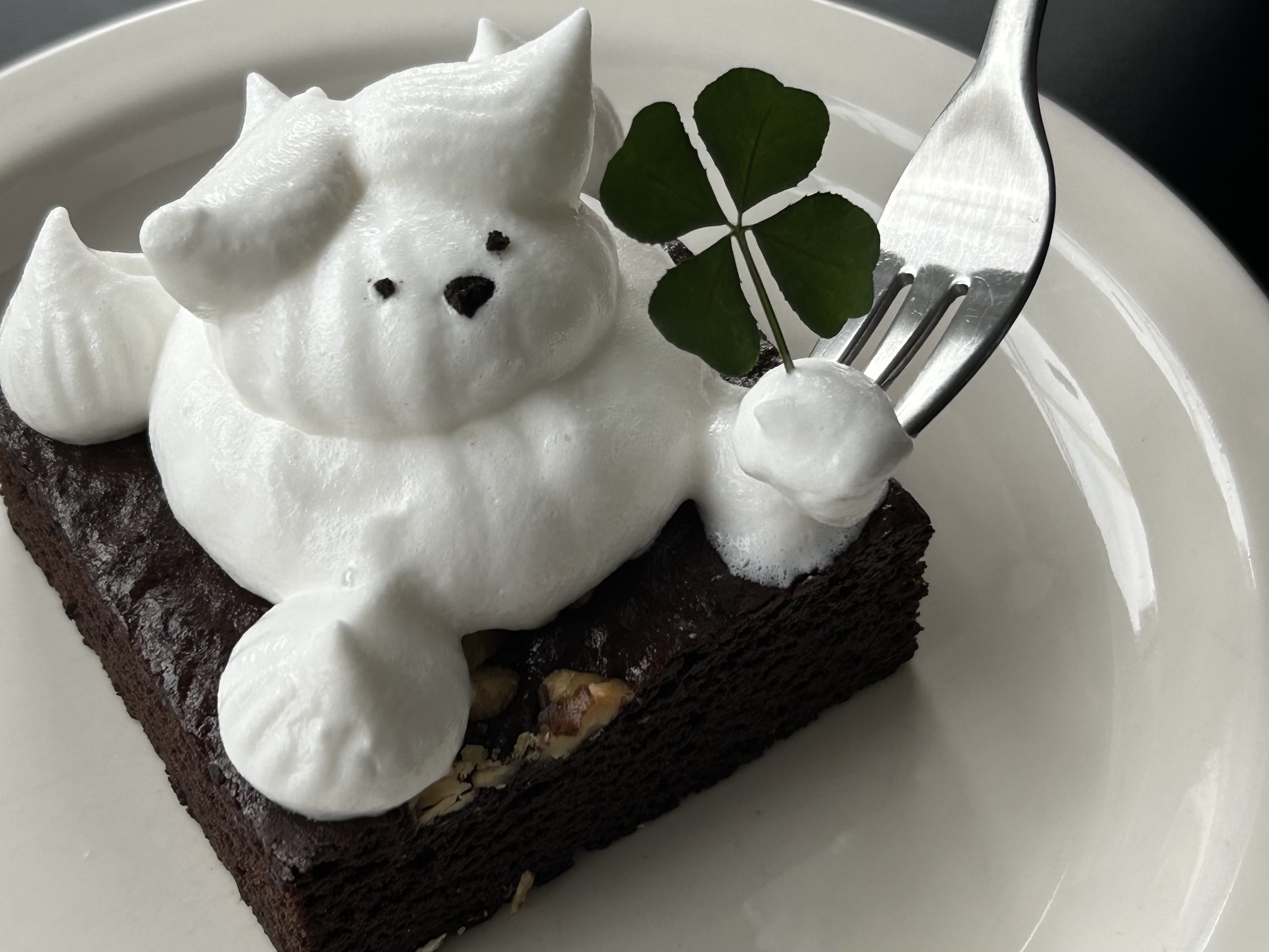 초코 브라우니 위에 있는 생크림 가나디는 네잎클로버를 손에 꼭 쥐고 있는데요.