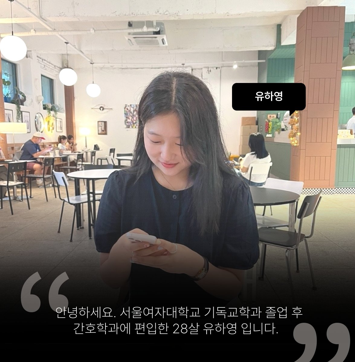 안녕하세요. 28살 유하영 입니다. 서울여자대학교 기독교학과를 졸업한 후, 간호학과로 편입해서 배우고 있습니다. 그래서 현재는 간호학과 24학번으로 재학 중입니다!