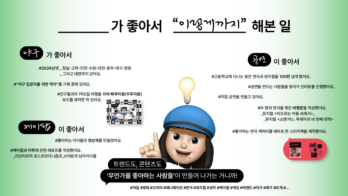 또, 캐릿이 1020 트렌드 전반을 다루는 미디어인 만큼, 제가 다양한 분야에 관심이 많다는 점을 강조하고 싶었어요. 예를 들어, 대학 시절 e스포츠 동아리에 들었던 일이나, 평소 연극·뮤지컬·야구 등 다양한 분야를 덕질해 온 이야기도 넣었고요. 포트폴리오 마지막 부분에 'OO가 좋아서 이렇게까지 해본 일' 이라는 슬라이드를 따로 만들기도 했습니다.