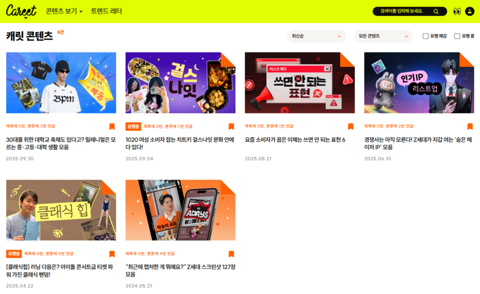 참여한 콘텐츠 모아보기사실 저는 과제 할 때 캐릿의 도움을 많이 받았어요. 트렌드를 한눈에 보기 좋아서 참고하기 좋았거든요. 그때를 떠올리면 제가 제보한 내용이 다른 누군가에게도 도움이 될 수 있지 않을까? 라는 생각을 하게 돼요. 뿌듯한 마음에 종종 캐릿에 제 이름 검색해서 참여한 콘텐츠를 한 번에 모아보기도 한답니다:)