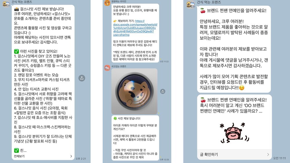 트렌드 크루 채팅방 공지 내용크루 채팅방에서 에디터분들이 특정 소재에 대한 제보를 받거나 인터뷰이를 모집하면, 크루들은 잘 알고 있거나 하고 싶은 주제를 골라서 제보하면 돼요. 굉장히 능동적이고 자율적인 활동이에요. 이후 제보한 사례가 채택되면 더욱 알찬 콘텐츠를 만들기 위해 에디터분들께서 직접 인터뷰를 요청하시기도 해요. 그 외에도 카카오톡 투표, 트렌드 반영 TO DO 리스트 작성, 매주 유행템 디깅 시트 기입, 사진 자료 제공 등 다양한 공지가 올라와요.