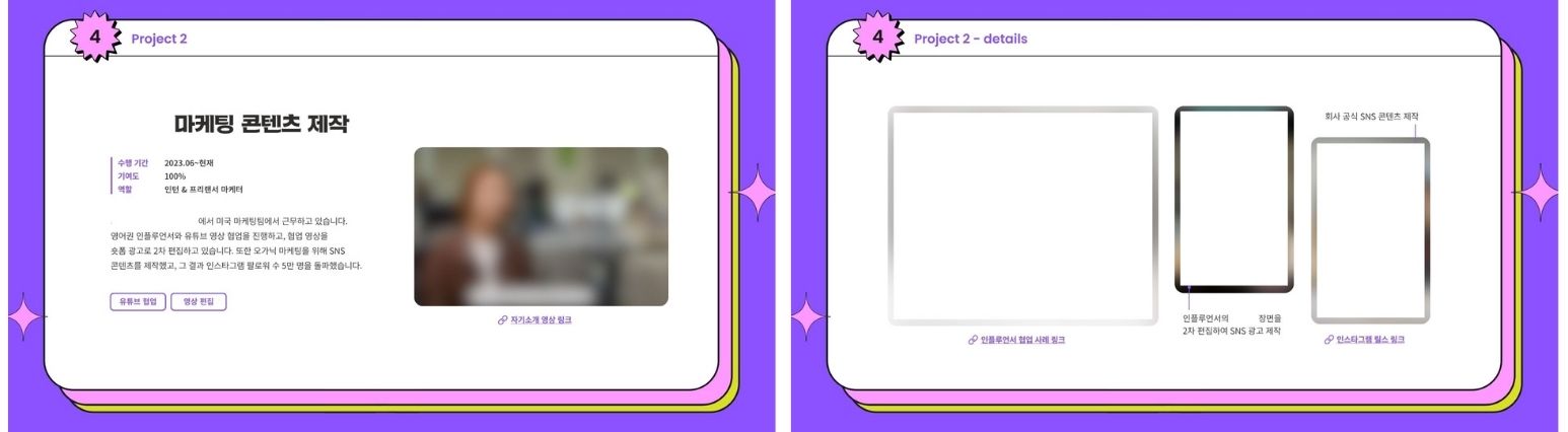 포트폴리오에는 자소서에는 다 담지 못한 직무 경험을 보여드리고자 했어요. 따라서 자기소개 영상을 포함하여, 영어권 인플루언서 협업 사례, 브랜드 SNS 콘텐츠 사례 등을 첨부하여 제 업무 역량을 어필했습니다.