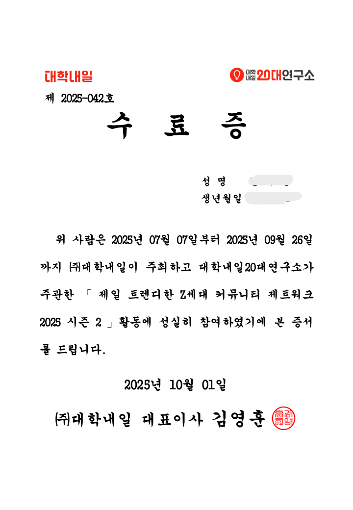 - 수료 조건 충족 시 제트워크 수료증 발급