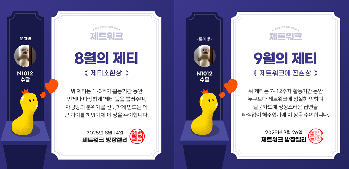 제트워크 활동이 끝나고 받는 수료증은 2가지 종류가 있는데요 진짜 증빙서류로 사용하는 수료증과 제트워크 카드예요. 이 카드 속 젤리는 매 시즌마다 달라져서 받는 재미가 쏠쏠하답니다 !