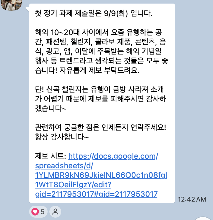 저는 지원 구글 폼을 작성하면서 "해외 특파원"이라는 포지션에 눈에 들어왔습니다. 제가 미국에 거주중이기 때문인데요, 아무래도 국내보다는 해외에 거주중인 한국인이 더 적을 것이기 때문에 저만의 차별점이 될 수 있다고 생각했습니다. 그래서 제가 미국의 유행과 문화를 잘 제보할 수 있다는 점을 다양한 제보건들을 예시로 작성하며 어필했습니다!