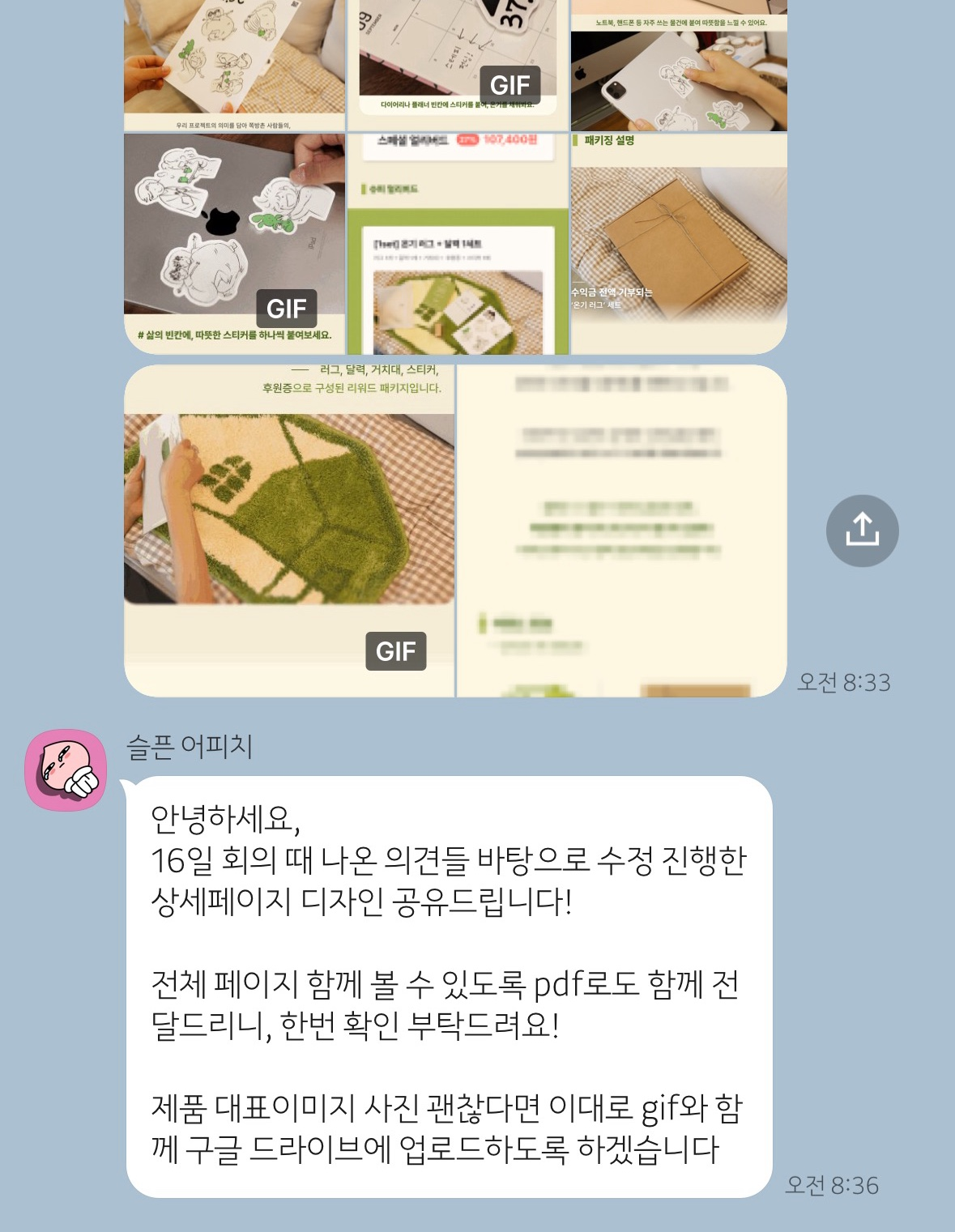 상세페이지 제작 및 수정 과정저희의 프로젝트 스토리를 잘 나타낼 수 있는 제품 상세페이지를 제작합니다. 상세페이지 제작도 디자인팀에서 진행했고, 전체 팀원들의 피드백 과정을 거쳤습니다. 내용이 많고, 구매와 직결되는 페이지이기 때문에 여러 번의 수정을 거쳐 완성했습니다. 상세페이지 제작 팁을 드리자면, GIF를 활용했을 때 생동감이 전해지는 것은 좋지만, 화질이 낮아 작은 글씨는 깨져 보이기 쉽습니다. 따라서 작은 글씨가 들어가는 부분은 이미지로 나타내고, 리워드 전체 사진이나 움직이는 장면 등 디테일이 덜 중요한 부분에서 GIF를 활용하는 것을 추천합니다.