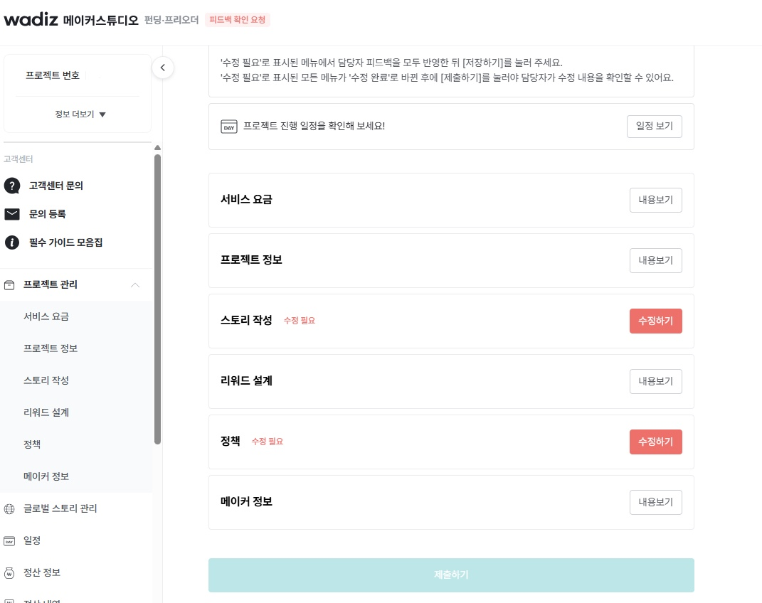 프로젝트 심사 과정상세페이지가 완성된 후에는 본격적으로 와디즈 내에 프로젝트를 생성합니다. 지원사업에서 제시하는 기한 내에 프로젝트를 진행해야 했기 때문에 일정이 매우 빡빡했습니다. 프로젝트를 생성하기 위해서는 승인 심사를 거쳐야 합니다. 심사 조건에 못 미칠 경우 수정을 해야 했는데, 사소한 부분에서 여러 번 보완 요청이 들어와 예정보다 며칠 정도 프로젝트 등록이 미뤄졌습니다. 조건을 잘 맞췄다고 생각해도 예상치 못한 변수가 생길 수 있으니, 기한을 넉넉하게 잡으면 좋을 것 같습니다.