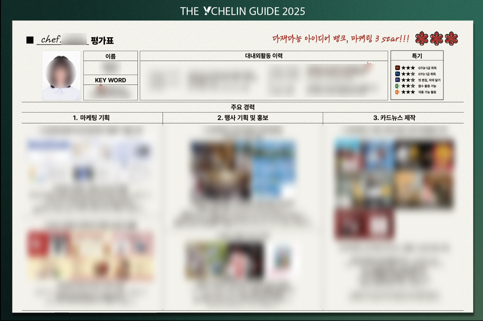 실제 23기 지원 당시 제출했던 포트폴리오 📋- 특이하게 Y퓨처리스트는 매 리크루팅마다 '컨셉'을 가지고 있는데요. (사실 리크루팅 컨셉도 YF 내 마케팅 TFT가 고안한답니다 🤓) 23기 리크루팅은 'Y다이닝', '셰프' 컨셉이어서 포트폴리오도 유사한 컨셉으로 디자인했습니다. 미슐랭 컨셉으로 미슐랭 심볼과 색 등을 차용해서 제작했어요!