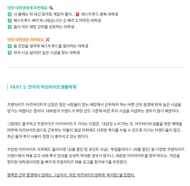 당시 제출했던 사전 미션 글 내용 일부그래서 글 구성에서도 단순 정보 전달에 더해 '이런 대학생에게 추천해요', '이런 대학생은 어려워요' 등 제 관점에서만의 포인트를 잡아 더 깔끔하게 보여드리고자 노력했습니다. 꼭 사전 미션만이 합격과 불합격을 가른다고 단언할 수는 없겠지만, 그만큼 중요하다는 생각으로 구성해 보시면 좋을 것 같아요.