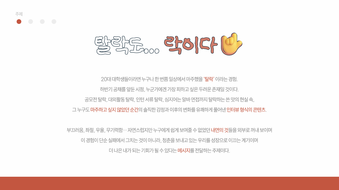 그래서 대학생의 탈락을 소재로 잡고, ‘인턴 면접 탈락’, ‘알바 면접 탈락‘, ’대외활동 탈락‘ 등 대학생이라면 한 번쯤 겪어봤을 탈락 이야기를 담았어요. 또, 후킹을 위해 <탈락도 락이다>라는 제목을 지었답니다.