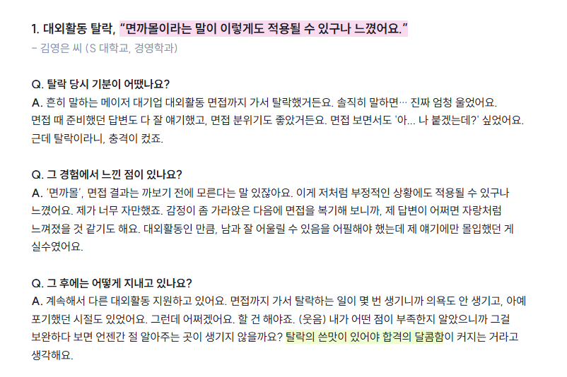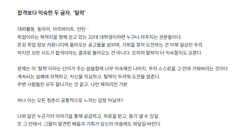 대학내일이 학생 리포터를 뽑는 이유는, ’진짜 대학생의 시선이 필요해서'라고 생각했어요. 그렇다면 '대학생만이 할 수 있는 이야기가 뭘까?', '대학생들은 어떤 이야기에 반응할까?'를 고민하다가, 당시 저의 가장 큰 관심사였던 ‘취준’을 떠올렸어요. 취준은 모든 대학생들의 걱정이자, 탈락의 아픔을 가장 크게 겪는 단계잖아요. 여기서 저는 탈락의 아픔에 집중해 이 아픔이 우리 모두의 이야기임을 얘기하고 싶었어요.