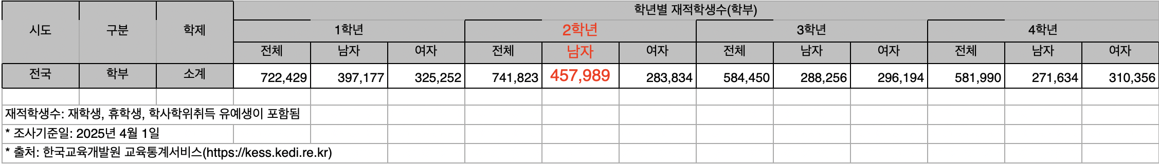 KESS에서 발표한 2025년 전국 대학교 학년별 재적학생수 통계 자료이다. 다른 학년들은 남녀 비율이 비슷한 반면, 2학년은 남학생의 비율이 압도적으로 높다. 실제로 많은 남학생들의 시간이 대학교 2학년에 머물러 있는 것이다.