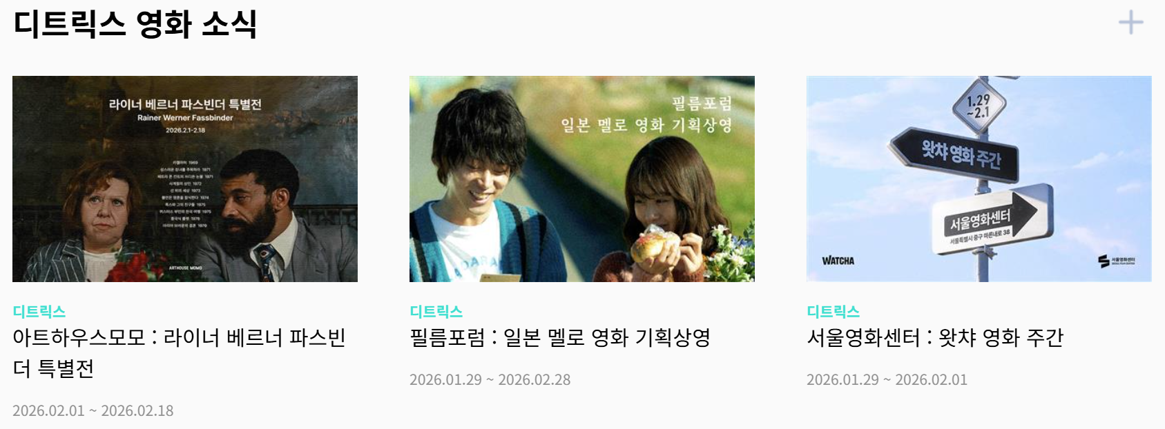 이런 식으로 최신 영화 및 극장 소식을 알려주어 기획전, 특별전 등의 정보를 손쉽게 얻을 수 있어요.