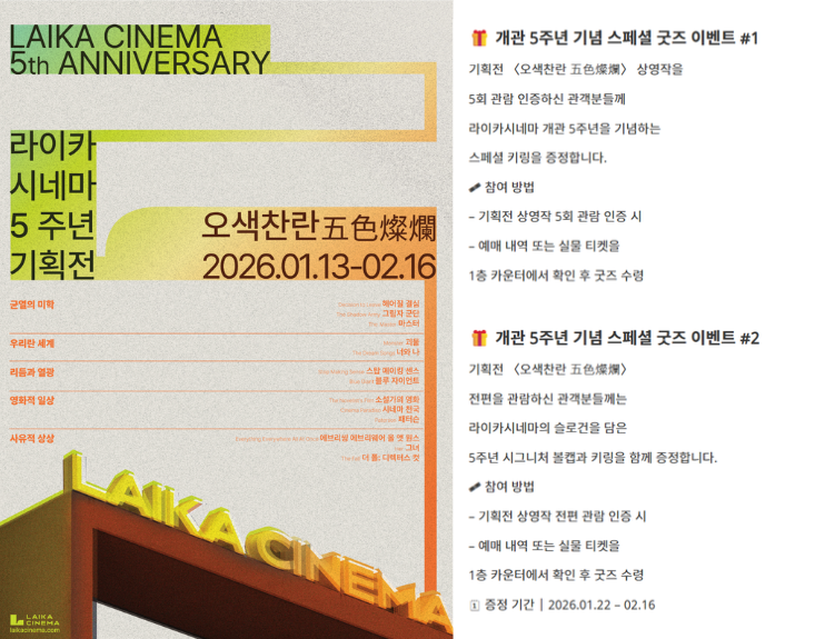 5주년을 맞이한 라이카시네마는 현재 개관 5주년 기념 기획전을 하고 있어요! 눈을 사로잡는 영화 라인업에 저도 벌써 3번이나 다녀왔답니다 >< 2번만 더 가면 스페셜 굿즈를 받을 수 있으니 도전해볼까 싶어요 ㅎㅎ.
