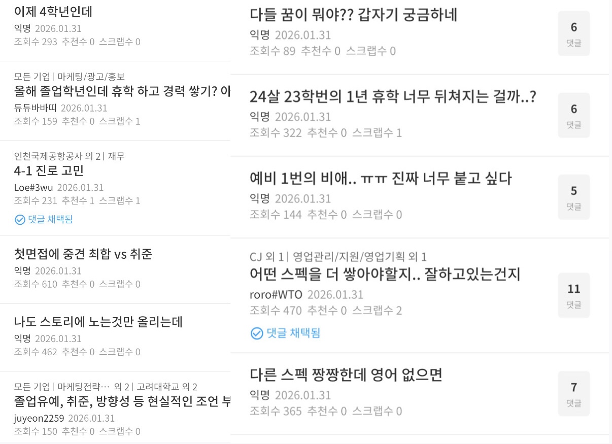 이것은 에브리타임, 링커리어 등 대학생과 취준생들이 가장 몰려 있는 SNS에서 자주 볼 수 있는 주제이다.