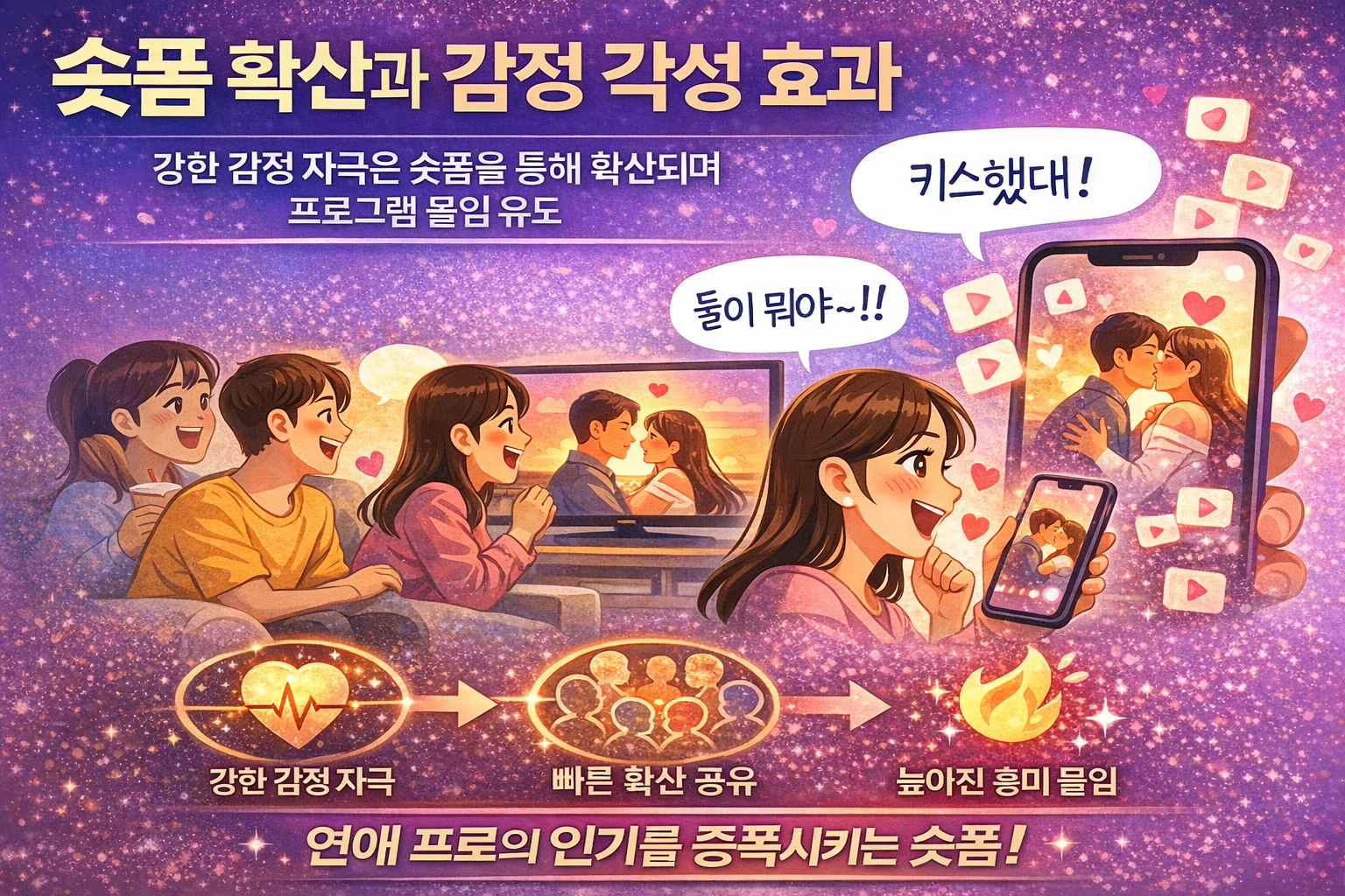 사실 우리가 연애 프로그램에 빠지는 이유는 '단순히 설레서'라기 보다 '뇌의 반응'때문입니다. 우리의 뇌는 거울 뉴런 시스템으로 인해, 연애 프로그램을 시청할 때 출연자를 관찰하는 것이 아닌 내가 그 상황의 주인공이 된 것처럼 반응하게 되어 시청할수록 더욱 몰입하게 됩니다.📱 숏폼 확산과 감정 각성 효과