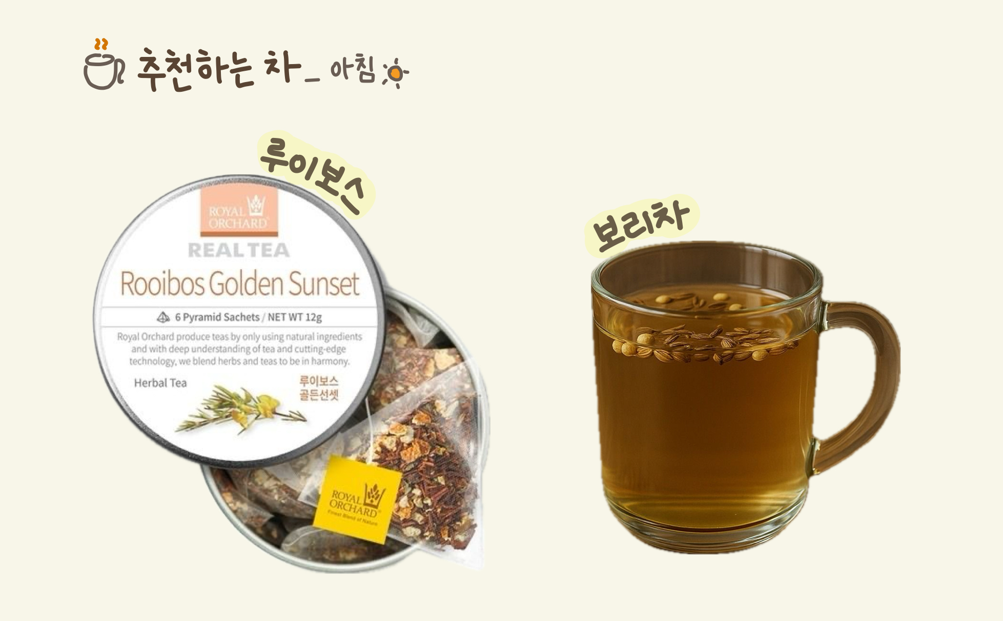 - 루이보스와 보리차는 카페인이 없고, 타닌 함량도 낮아서 공복 섭취에 부담 없는 차라 아침에 물처럼 드시길 추천해 드려요 :)
