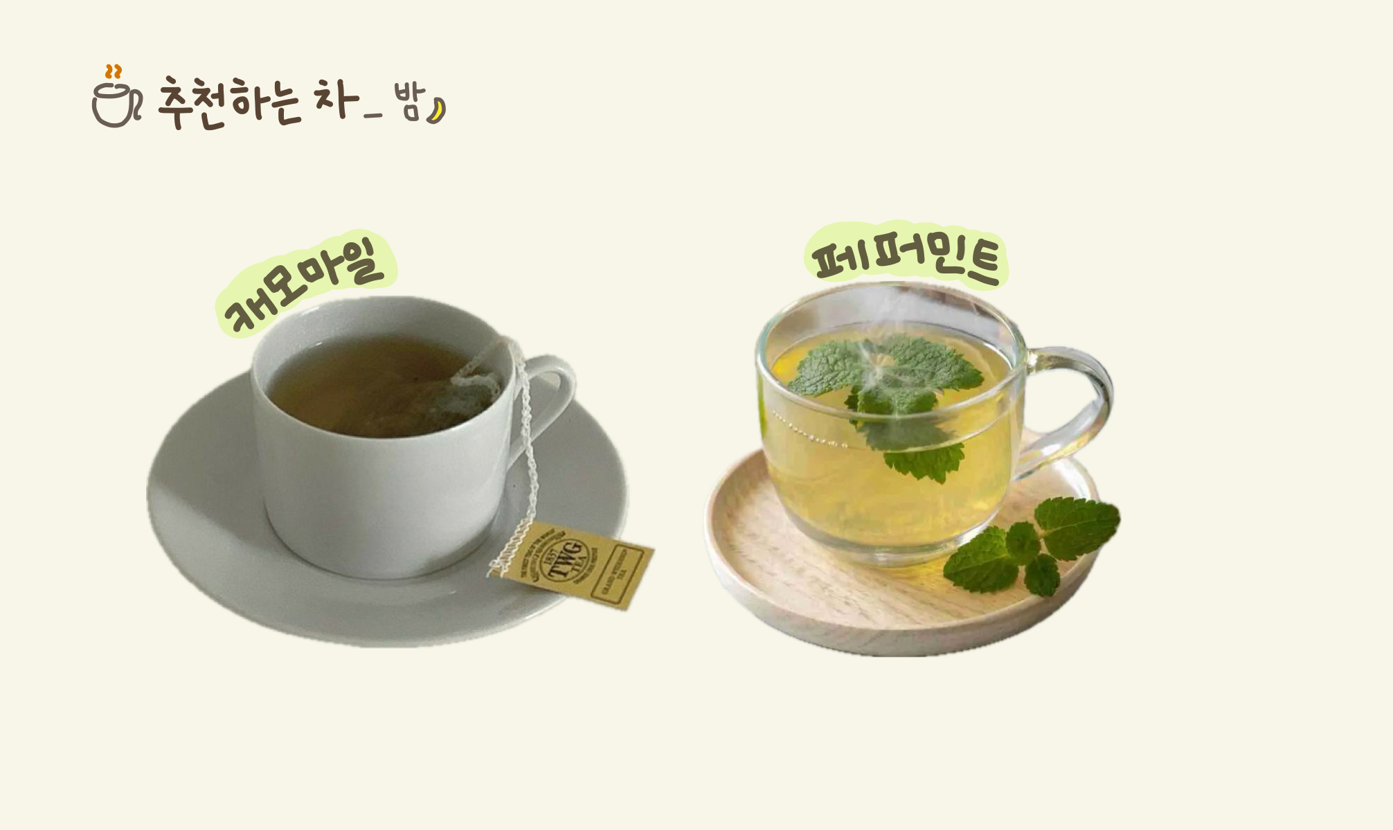 - 캐모마일과 페퍼민트 모두 무카페인으로 수면 전 섭취에 부담 없고, 따뜻하게 우려 마시는 차는 수면의 질 개선에도 도움이 된다고 해요 :)